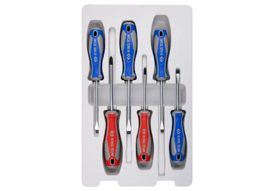 Zestaw 6 wkrętaków King Tony. W zestawie śrubokręty krzyżakowe No.1x80 oraz No.2x100 i płaskie 5x75, 5x100, 6.5x100, 6.5x150. Karta produktu - 31216MR