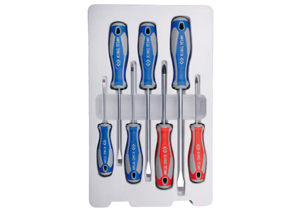 Zestaw wkrętaków płaskich oraz krzyżakowych King Tony. Każdy wkrętak wykonany z wysoką precyzją, posiada gumową rączkę ułatwiającą pracę. W zestawie znajduje się 7 wkrętaków, dwa krzyżakowe: No.1x80 i No.2x100 oraz płaskie: 3x75, 4x100, 5.5x125, 6.5x150, 8x175. Karta produktu - 30117MR