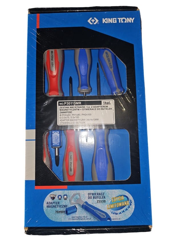 Zestaw wkrętaków płaskich oraz krzyżakowych King Tony. Każdy wkrętak wykonany z wysoką precyzją, posiada gumową rączkę ułatwiającą pracę. W zestawie znajduje się 5 wkrętaków, dwa krzyżakowe: No.1x80 i No.2x100 oraz płaskie: 4x100, 5.5x125, 6.5x150.