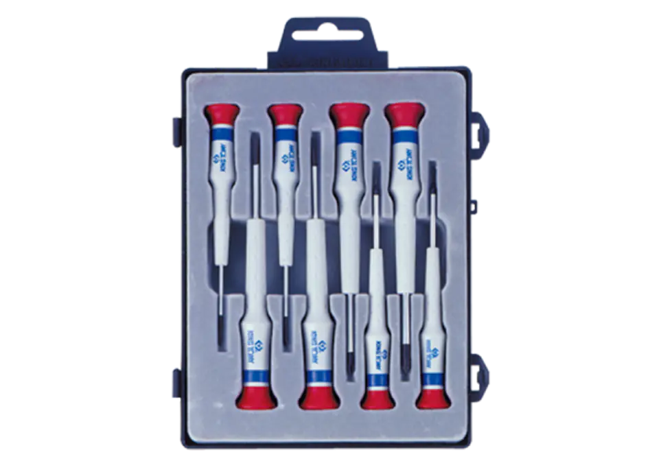 Zestaw wkrętaków precyzyjnych King Tony w plastikowym pudełku z uchwytem do powieszenia. Zestaw dla majsterkowiczów, do prac precyzyjnych. W zestawie znajduje się 8 śrubokrętów w rozmiarach: krzyżak No.000x40, No.00x40, No.0x40, No.1x40 oraz płaski 1.5x40, 2.0x40, 2.5x40, 3.0x40. Karta produktu - 32108MR