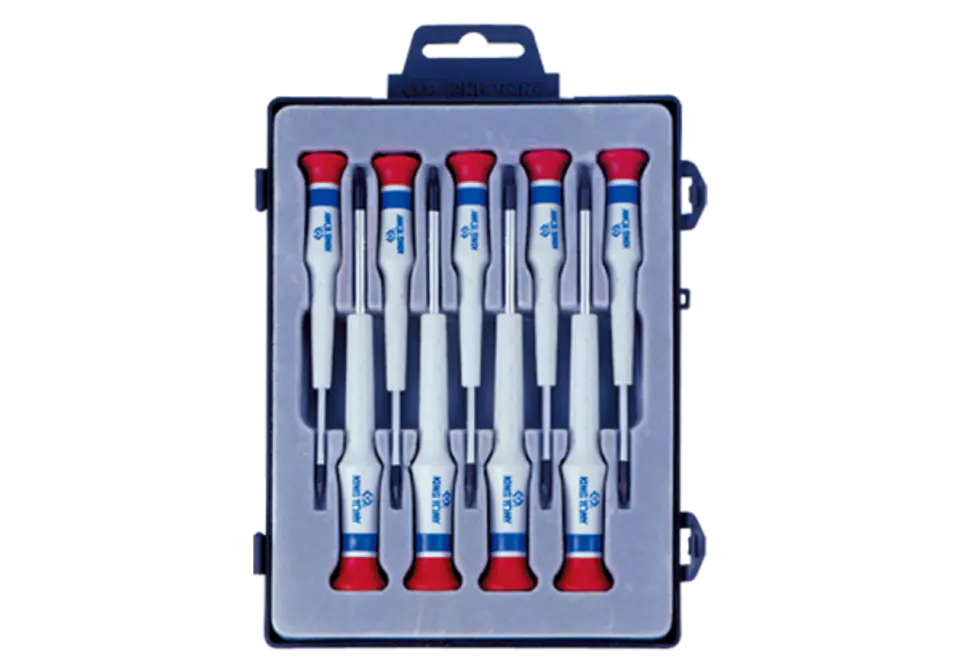 Zestaw wkrętaków precyzyjnych TORX firmy King Tony. W zestawie znajduje się 9 wkrętaków oraz plastikowe pudełko z uchwytem do powieszenia. Rozmiary śrubokrętów: T4x40, T5x40, T6x40, T7x40, T8x40, T9x50, T10x50, T15x50, T20x50 Karta produktu - 32309PR