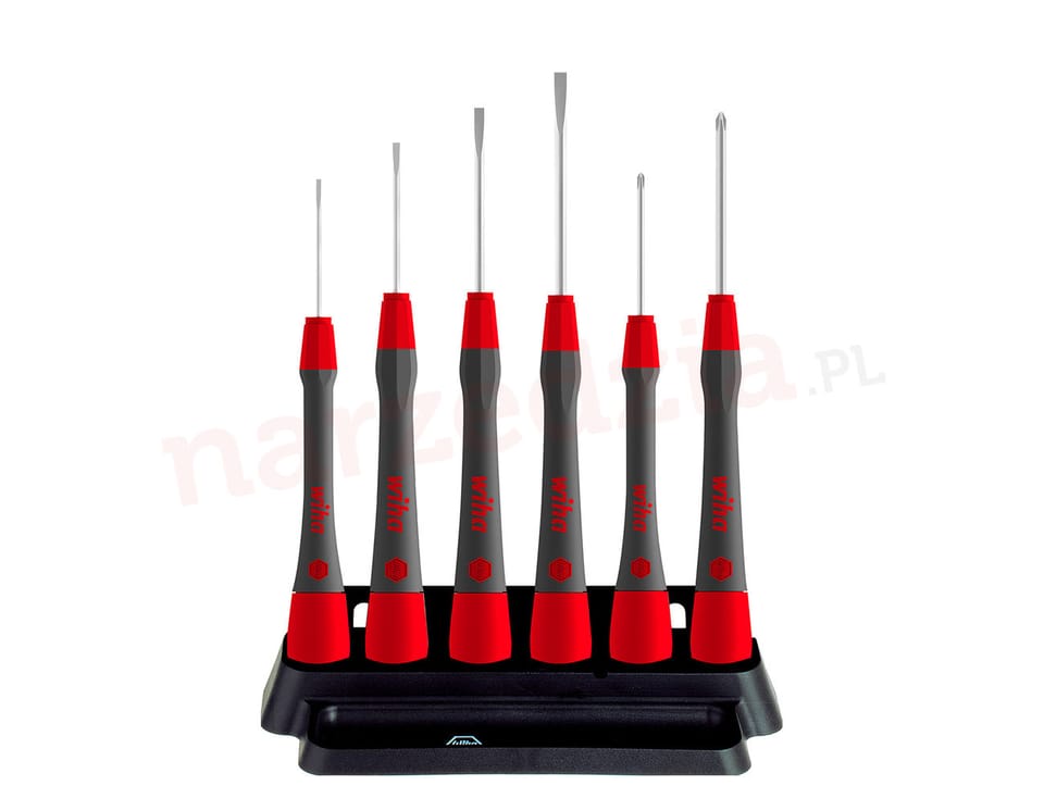 W przypadku połączeń śrubowych w mechanice precyzyjnej wyzwaniem jest praca z odpowiednim wyczuciem, tak by nie uszkodzić obrabianego elementu. Wkrętaki precyzyjne PicoFinish® firmy Wiha dzięki swoim długim, smukłym rękojeściom i strefie szybkiego obrotu nadają się idealnie do wykonywania precyzyjnych prac przy delikatnych elementach z dziedziny elektroniki i mechaniki precyzyjnej. Ergonomiczne wzornictwo rękojeści ze strefą miękką zapewnia komfort pracy. Pełne wyczucia i szybkie obracanie wspomagane jest przez kołpak obrotowy poruszający się bez oporu. Ponadto nadrukowane na kapturkach obrotowych wkrętaków symbole ułatwiają wybór wkrętaka o właściwym profilu. Zestaw zawiera 6 wkrętaków precyzyjnych PicoFinish® i uchwyt. W tym ostatnim można wygodnie przechowywać wkrętaki precyzyjne na stanowisku pracy.