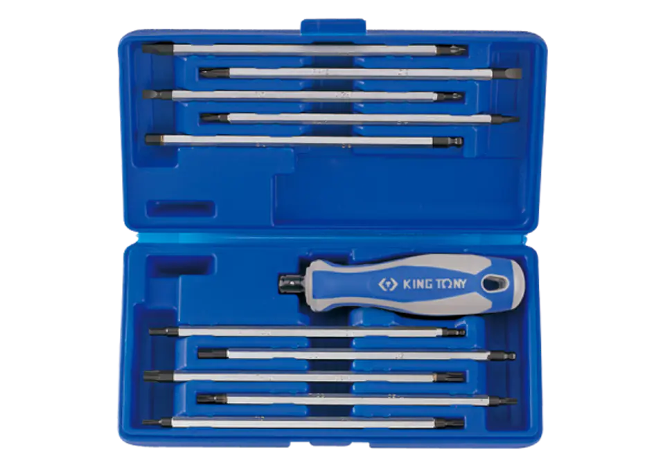 Zestaw wkrętaków z wymiennymi grotami King Tony. Zestaw w plastikowym pudełku zawiera uniwersalną, gumowo-plastikową rączkę oraz 10 wkładów. Rozmiary wkładów: płasko-krzyżakowe 4.0--PH1, 6.0--PH2, płaski-pozidriv 5.0xPZ1, 7.0xPZ2, TORX T10--T15, T20--T25, T30--T40, HEX 4.0--4.0, 5.0--5.0, 6.0--6.0. Karta produktu - 32518MR01