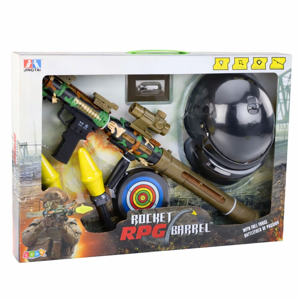 Zestaw wojskowy z bazooką RPG to niezwykle emocjonująca propozycja dla dzieci, które uwielbiają dynamiczne i tematyczne zabawy w wojsko, akcję oraz precyzyjne celowanie. Duży, efektowny karabin stylizowany na wyrzutnię rakiet został wyposażony w trzy rakiety, celownik optyczny, tarcze strzelecką oraz akcesoria montażowe, które umożliwiają szybki montaż i demontaż dodatkowych elementów. Całość dopełnia hełm ochronny, który pozwala wczuć się w rolę żołnierza i wprowadza dziecko w świat strategicznych misji i ekscytujących przygód.