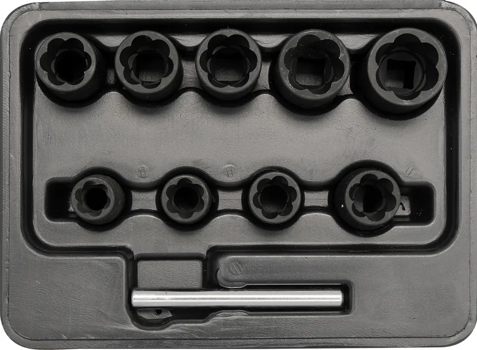 Zestaw wykrętaków do śrub wykonany jest ze stali chromowo molibdenowej CrMo o wysokiej twardości 52-55 HRCNasadki w rozmiarach od 10 - 17 mm oraz 19 mm posiadają specjalny kształt umożliwiający zaklinowanie na zniszczonej śrubie lub nakrętce, dzięki czemu następuje wykręcenie uszkodzonej części.