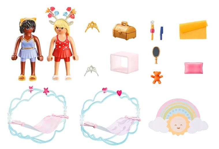 Pora na zabawę z tęczowymi księżniczkami na niebiańskim piżama party PLAYMOBIL. Zanim dwie tęczowe księżniczki ułożą się do snu w kołyszących się łóżkach, ozdabiają je błyszczącymi klejnotami. Następnie przenoszą się do krainy marzeń i snów z czarującymi postaciami, magicznymi stworzeniami i bajkowymi budynkami. Niebiański świat PLAYMOBIL zabiera dzieci do magicznej, pełnej przygód krainy w chmurach.