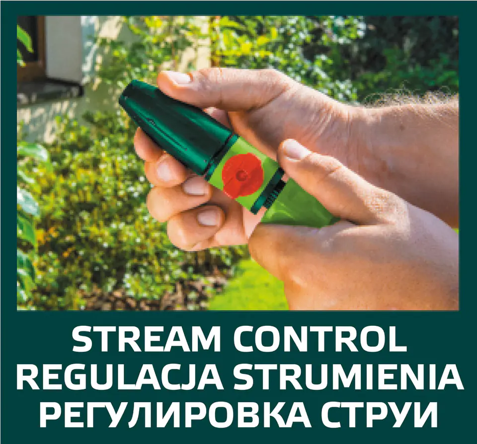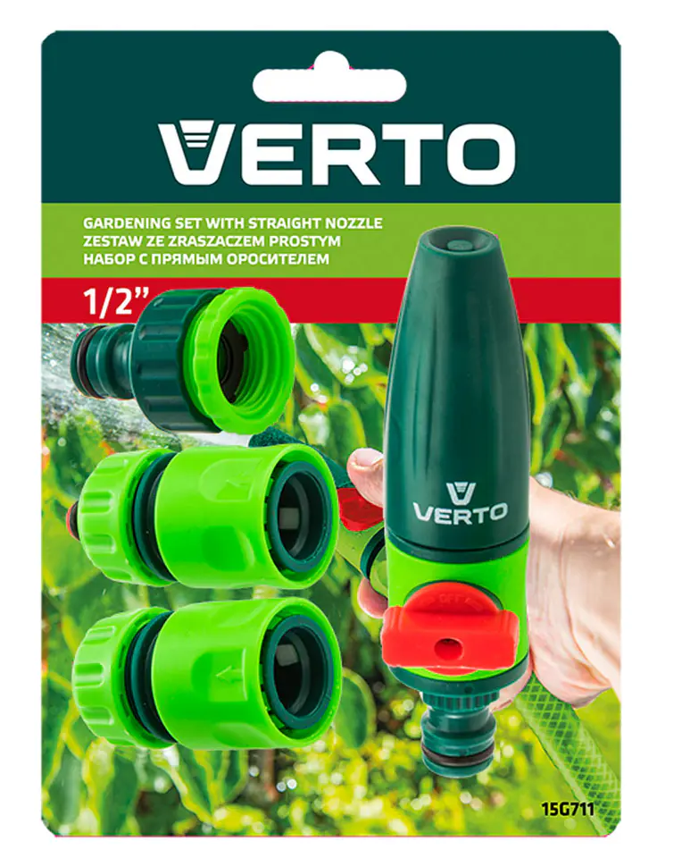 Zestaw ze zraszaczem prostym, złączkami jednomateriałowymi, przyłączem do kranu, 4 elementy: zraszacz prosty z blokadą wypływu wody, złączka przelotowa 1/2", złączka stop 1/2", przyłącze do kranu 1/2"