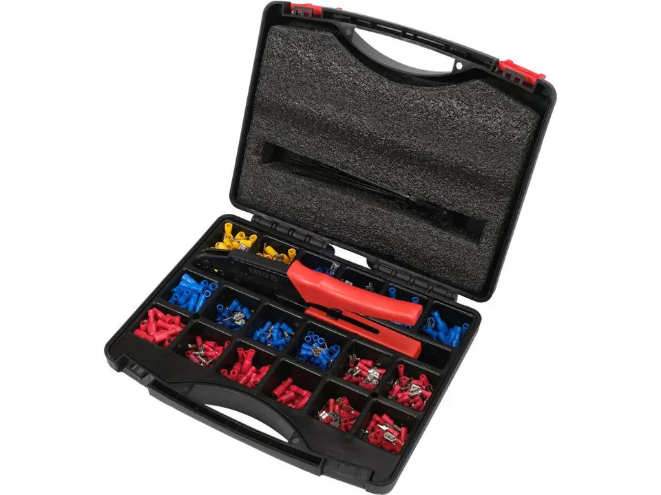 Zawartość zestawu: szczypce do zaciskania konektorów, złącze elektryczne x500, opaska plastikowa x50 (2.5 mm x 100 mm)