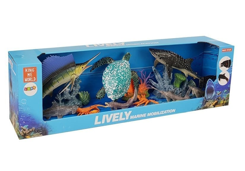 Zestaw złożony jest z 10 elementów, występują w nim: koralowce, rak, krab, rekin młot, płaszczka, ryba piła , żółw i inne. Trzy większe zwierzęta morskie posiadają ruchomy części ( żółw, dwie ryby). Dzięki czemu twoje dziecko będzie mogło poruszać płetwami, głową, ogonem. Rozpocznie swoją przygodę pływając po głębiach oceanu.