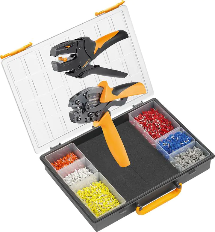 Wykonanie: tulejki kablowe z kołnierzem z tworzywa sztucznego, przekrój przewodu 0,5 do 4 mm2. Dostawa w walizce z tworzywa sztucznego.