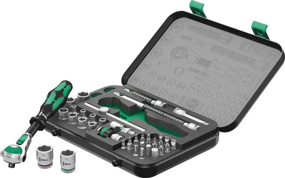 Narzędzia te są umieszczone w 2-kolorowym wkładzie piankowym, gdzie miejsca po brakujących narzędziach są dobrze widoczne. W stabilnej kasecie metalowej z antypoślizgowymi nóżkami gumowymi.