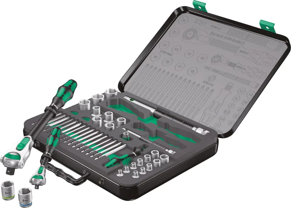 Wykonanie: narzędzia ze stali chromowo-wanadowej. Grzechotka Zyklop łączy w sobie zalety 5 różnych typów grzechotek i dzięki swojej specjalnej konstrukcji zapewnia bardzo szybką pracę. Głowica grzechotki obraca się swobodnie i można ją ustawić w 5 różnych pozycjach (90° i 75° w obu kierunkach oraz 0°). W pozycji 0° może pełnić funkcję uchwytu do bitów. 72 zęby, kąt powrotu 5°. Ergonomiczna, rękojeść Kraftform® Plus z ustalaczem kulkowym gwarantuje pewne osadzenie nasadki. Przełączanie w prawo i w lewo oraz zwalnianie nasadek jest możliwe w każdej pozycji. Narzędzia te są umieszczone w 2-kolorowym wkładzie piankowym, gdzie miejsca po brakujących narzędziach są dobrze widoczne. W stabilnej kasecie metalowej z antypoślizgowymi nóżkami gumowymi.