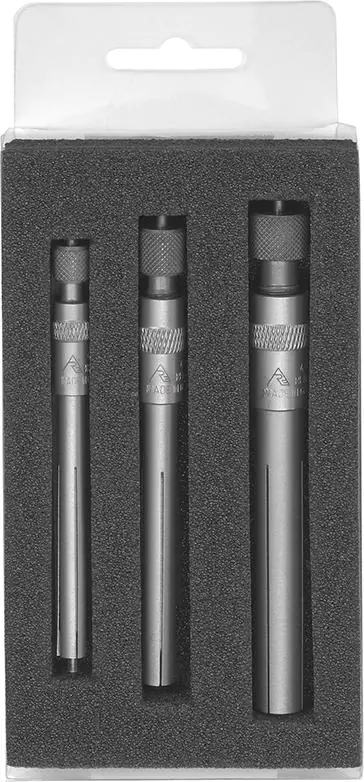 Wykonanie: specjalna stal narzędziowa, kieł przelotowy hartowany specjalnie, z możliwością szlifowania, szczelinowa tulejka centrująca i śruba radełkowana. Dostarczane w opakowaniu z tworzywa sztucznego.