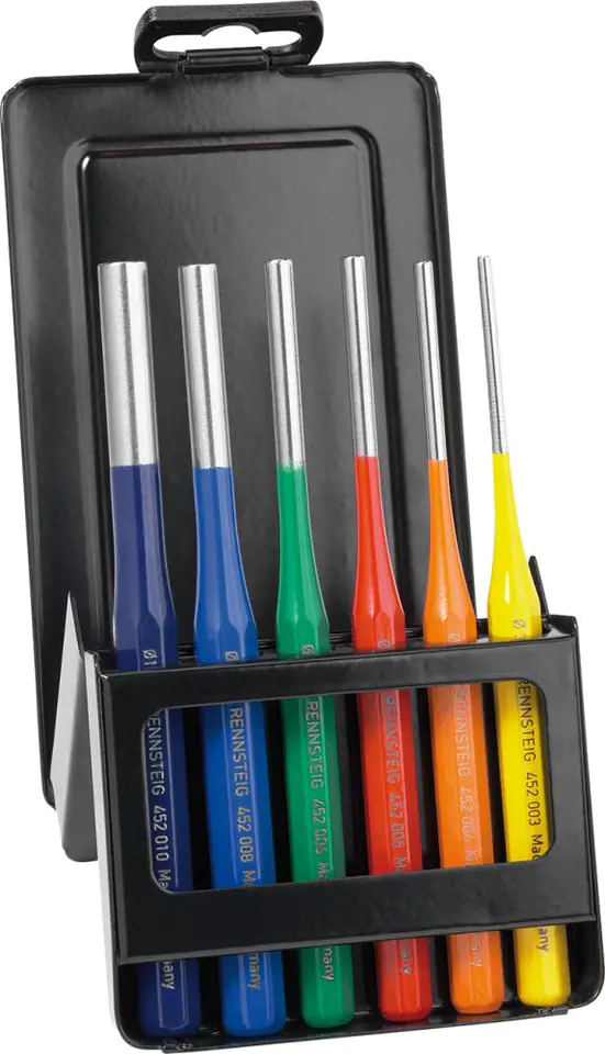 Wykonanie: podobny do DIN 6450, z ośmiokrawędziowej, na wskroś ulepszanej cieplnie, wysokostopowej stali narzędziowej (59 HRC). Około 9% twardsze od normalnych wybijaków. Chromowany, rękojeści powlekane proszkowo kolorowo, ułatwiające szybkie odnalezienie szukanej średnicy z bezpieczną głowicą udarową. Dostawa w kasecie z blachy stalowej.