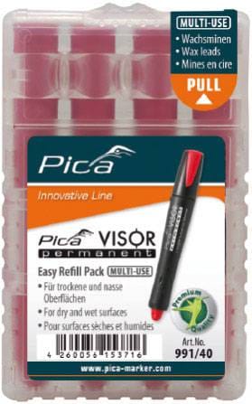 Pica VISOR Permanent (napełnialny) to innowacyjny marker woskowy o uniwersalnym zastosowaniu. Cztery zapasowe wkłady w przemyślnym opakowaniu, umożliwiającym wielokrotne napełnianie markera Pica VISOR Permanent Longlife do użytku przemysłowego. Do trwałego znakowania praktycznie wszystkich materiałów (niezależnie od stanu powierzchni: sucha/mokra, gładka/szorstka, zakurzona/zaolejona, ciemna/jasna). Niezawodny marker, który nie wysycha. Ekonomiczny: jeden wkład ma żywotność odpowiadającą pięciu konwencjonalnym markerom (tuszowym lub z farbami). Bardzo przyjazny dla środowiska i praktyczny dzięki szybkiemu napełnianiu.