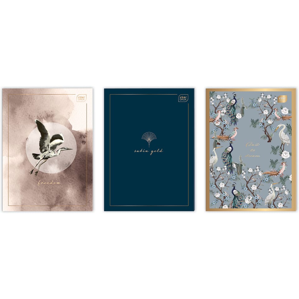 - Okładki: 3 różne okładki, z efektem złotej matowej metalizy z modnym motywem natury lub z abstrakcyjnym wzorem.