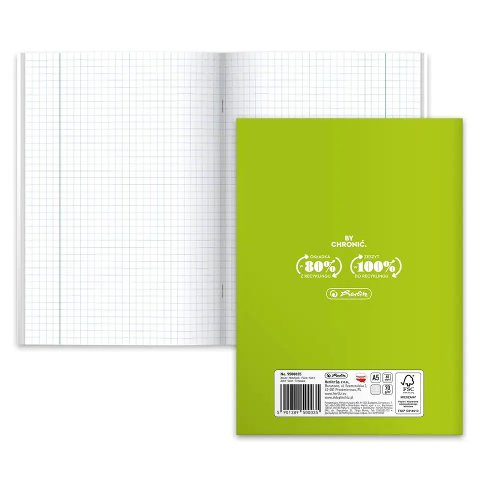 Okladki są wykonane z ekologicznego propylenu. 80% surowców do produkcji okladek pochodzi z recyklingu postprodukcyjnego.