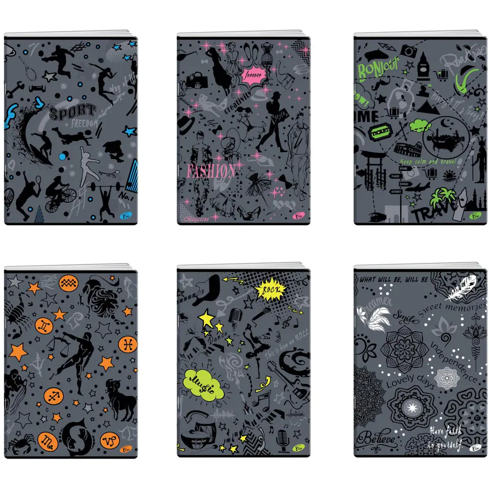 Kolekcja SYMBOLS to zeszyty z ciekawymi symbolami na matowych okladkach z elementami lakieru blyszczącego. Wszystkie pasje zostaly pokazane graficznie - są tu zarówno zeszyty dla milośników mody, astrologii, jak równiez muzyki.