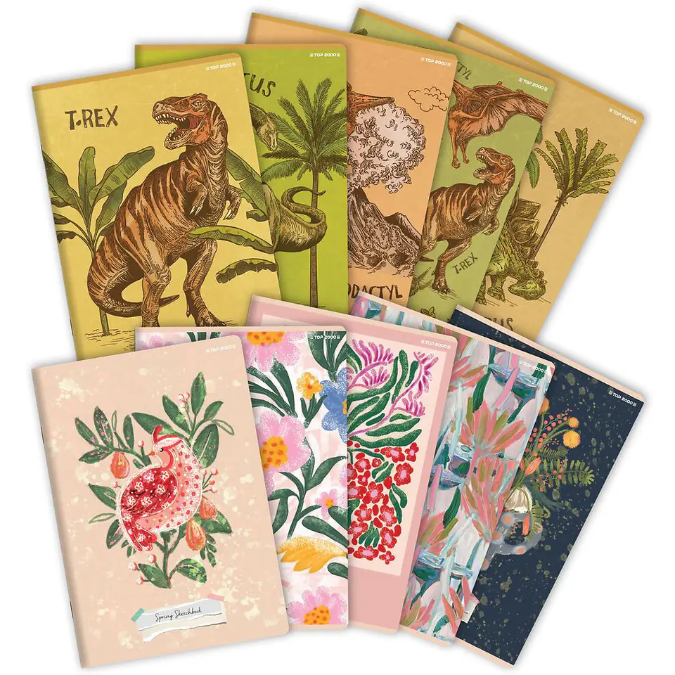 Kolekcja zeszytów inspirowana światem dinozaurów i domowymi kwiatami - lączy w sobie 2 zupelnie rózne style ilustracji.