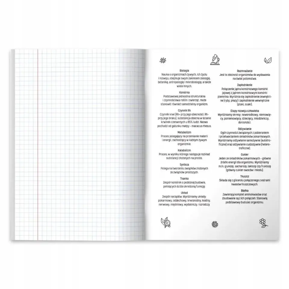 Zeszyt do biologii dla wszystkich uczniów. Okladka wykonana z grubego papieru jest miekka w dotyku dzieki wykonczeniu folią soft touch. Na froncie, oprócz nazwy przedmiotu, znajduje sie zabawny tekst a na okladce wewnetrznej są najwazniejsze zagadnienia z danego przedmiotu! Taka "mala ściąga" dla kazdego!