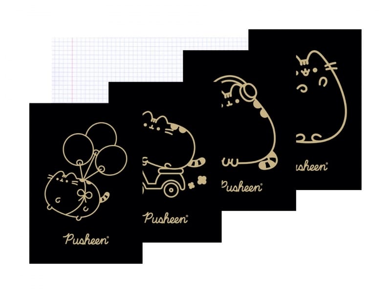 Zeszyt posiada okładkę czarnego koloru, ze złotym motywem Kotka z serii Pusheen The Cat.