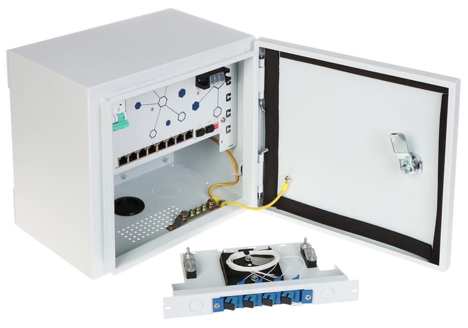 Zestaw EXPERT-POE/OTD-82GSFP składa się z 8-portowego switcha PoE, wyposażonego dodatkowo w 2 porty SFP Uplink, zintegrowanego z przełącznicą światłowodową, bezpiecznikiem oraz odgromnikiem, zamkniętych w obudowie zewnętrznej o klasie szczelności IP55