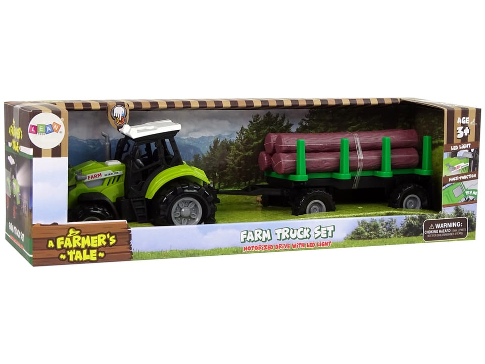 Pojazd został wyposażony w odczepianą przyczepę, na której można przewozić dołączone do zestawu bale drewna. Przyczepa posiada cztery stabilne koła, dzięki czemu z łatwością pokonuje różne przeszkody i zapewnia płynny transport materiałów. Efekty dźwiękowe i świetlne sprawiają, że zabawa staje się jeszcze bardziej realistyczna – przycisk na masce traktora uruchamia odgłosy jazdy i działania silnika, a reflektor oświetla drogę farmerowi.