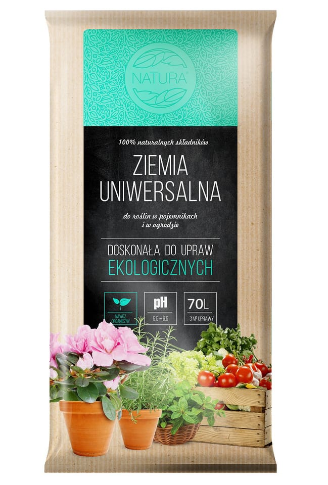 Ziemia ze średnio i silnie rozłożonego torfu wysokiego oraz Ecofibrex ( specjalnie przygotowane włókna drzewne). Zarówno torf jak i Ecofibrex są surowcemi w pełni organicznymi, czystymi, nie zawierają patogenów. Mogą być stosowane w uprawach ekologicznych. Ziemia uniwersalna „Natura”, zawiera zwiększoną dawkę ekologicznego, organicznego nawozu pochodzenia roślinnego w dawce startowej. Ilość ta pozwala na przyjęcie się rośliny w podłożu i wystarcza, w zależności od jej wymagań pokarmowych na okres od 2 do 4 tygodni.