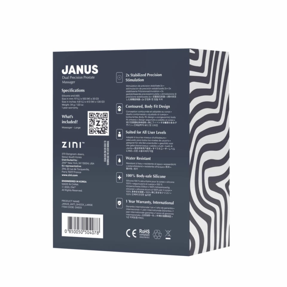 Wyprofilowany kształt oraz ergonomiczna powierzchnia gwarantują wygodne dopasowanie do ciała, a jednocześnie umożliwiają precyzyjną stymulację wybranych miejsc. Zini JANUS Anti Shock L został wykonany z najwyższej jakości hipoalergicznego silikonu medycznego oraz wytrzymałego tworzywa ABS, co zapewnia bezpieczeństwo i łatwość w utrzymaniu czystości. Model jest wodoodporny, co pozwala na użytkowanie w rożnych warunkach oraz łatwe czyszczenie.