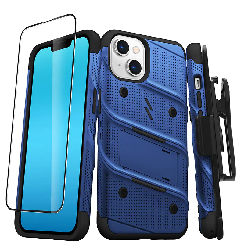 ZIZO BOLT Series - Pancerne etui iPhone 14 ze szkłem 9H na ekran + uchwyt z podstawką niebieski