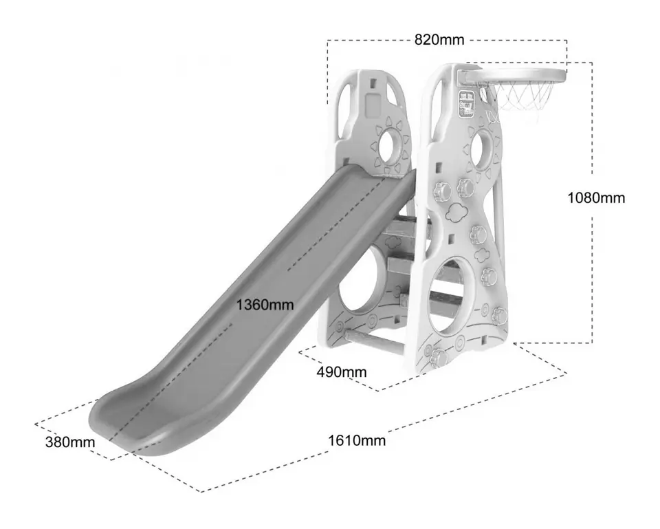 długość 128 cm, szerokość 161 cm, wysokość 124 cm, długość ślizgu 136 cm, długość z obręczą do koszykówki 160 cm, wymiary i waga w opakowaniu: 137 x 37 x 64 cm / 17 kg.