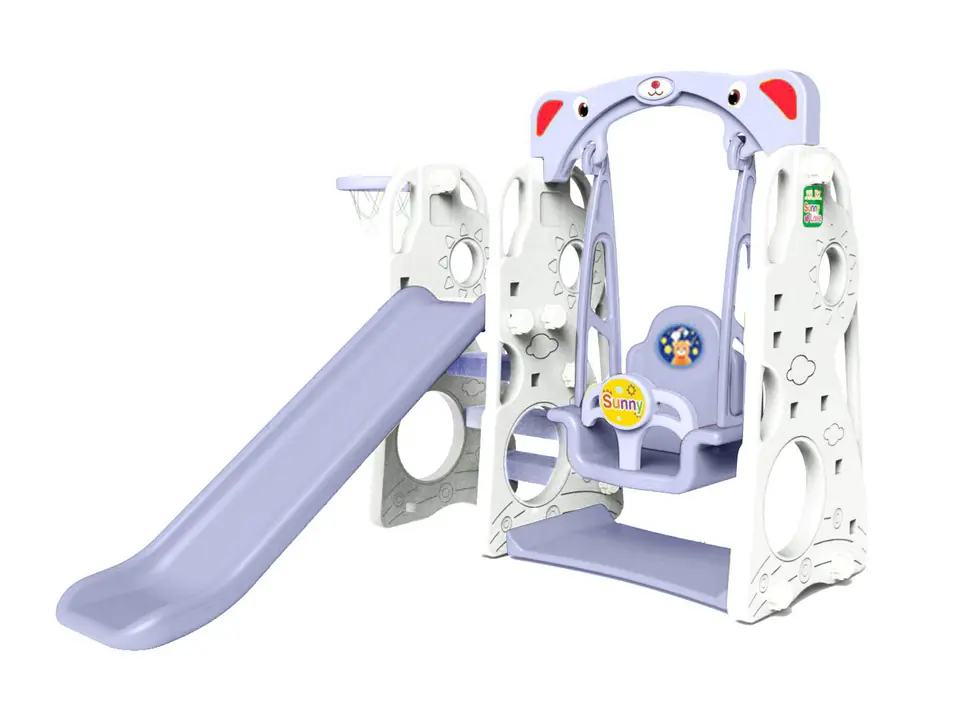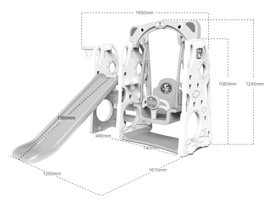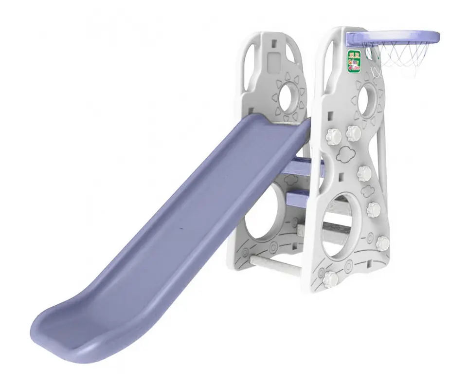 szeroka stabilna huśtawka, siedzisko ze zdejmowanym zabezpieczeniem, sztywne pałąki huśtawki, poprawiające stabilność w trakcie zabawy, szeroki podest wzmacniający konstrukcje, wysokie oparcie huśtawki, długi ślizg zjeżdżalni z podwójnego plastiku, szerokie bezpieczne stopnie zjeżdżalni, obręcz do koszykówki z siatką, piłka do gry, budowa huśtawki pozwalająca na zmianę układów konstrukcji.