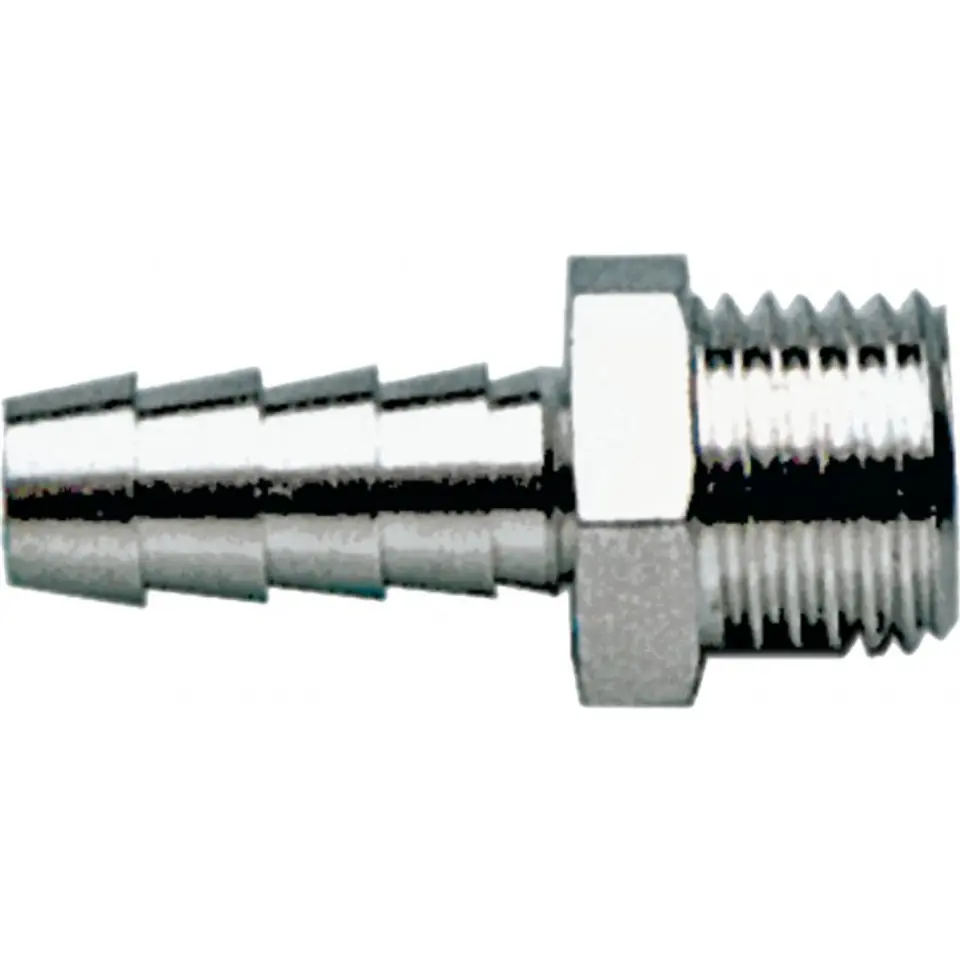 Złącze do węża 10 mm z gwintem zewnętrznym 1/4", mosiężne, niklowane, maksymalne ciśnienie 16 barów, CE