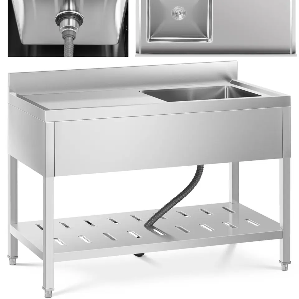 Kod producenta: 10011686Zlew gastronomiczny marki Royal Catering sprawdzi się jako wyposażenie każdej profesjonalnej kuchni a także laboratorium. Stół ze zlewem ma wymiary 120 x 60 cm. Duży zlew o wymiarach 490 x 420 x 245 mm pomieści garnki, patelnie czy ruszty grillowe. Wysokie ścianki zapobiegają rozchlapywaniu wody. Odpływ umieszczony został na środku, specjalne sitko wyłapuje resztki jedzenia i zapobiega zatykaniu rur. Obok zlewu znajduje się półka na której można położyć umyte naczynia. Rant o wysokości 10 cm chroni ściany przed zachlapaniem. Zlew wykonany został ze stali nierdzewnej wysokiej jakości, jest odporny na korozję, łatwy w utrzymaniu czystości i pasuje do każdej kuchni. Regulowane nóżki pozwalają dopasować mebel do indywidualnych potrzeb.Cechy produktu: