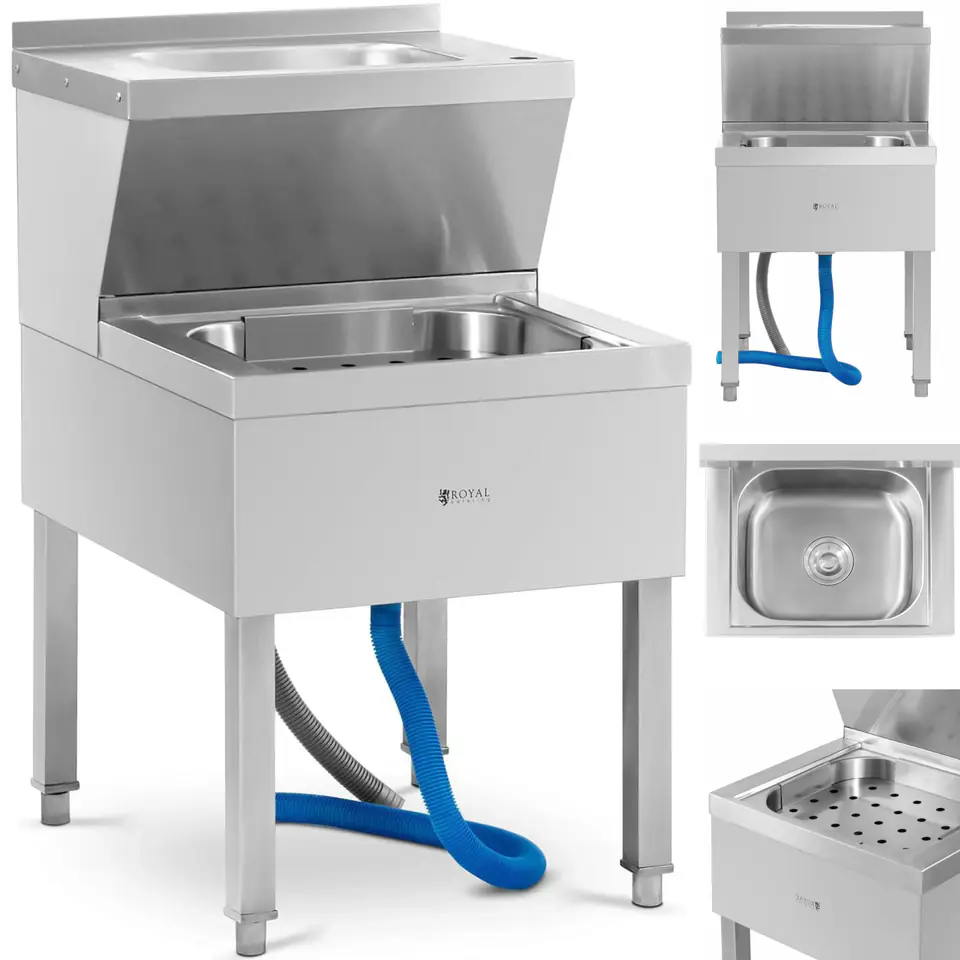Kod producenta: 10012596Zlew porządkowy marki Royal Catering uprości pracę w kuchni. Pozwala wstępnie wyczyścić naczynia przed użyciem zmywarki lub szybko je umyć. Kompaktowe wymiary sprawiają, że znajdzie miejsce w każdym pomieszczeniu z przyłączem wody i odpływem. W górnej części o wymiarach 33 x 23 x 12 cm znajduje się wnęka na baterię zlewozmywakową. Lokalizacja jest idealna, ponieważ również dolny zlew (37,5 x 31,5 x 17 cm) może być stamtąd zasilony wodą. Ta specjalna konstrukcja sprawia, że naczynia można wstępnie opróżnić u dołu i opłukać u góry. Górna umywalka ma pojemność 5,9 litra. Rant chroni ścianę przed zabrudzeniem. Obszerny zlew dolny ma pojemność 15 l, a odpływ o średnicy 80 mm jest idealny do ścieków. Cztery solidne nóżki gwarantują stabilność. Zlew wykonano ze stali nierdzewnej, jest wytrzymały, łatwy w czyszczeniu i odporny na korozję.Cechy produktu: