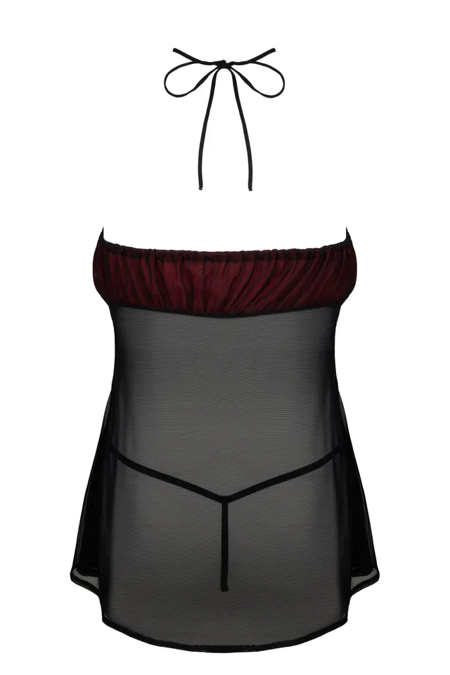 Ekskluzywna koszulka nocna ze stringami w zestawie. Komplet Febrenn łączy w sobie tajemniczą elegancję i oryginalny krój, w którym podkreślisz atuty urody nie pokazując za wiele. Koszulka długości za pośladki, wiązana na szyj cienką tasiemką. Przy dekolcie wszyta barwna kokardka. Ciekawie szyty biust ze ściągaczem na całej szerokości – świetnie podkreśli nawet małe piersi. Koszulka lekko drapowana, bardzo ładnie układa się na ciele w trakcie ruchu. Półprzezroczysty materiał pozwala dostrzec piękną kobiecą talię i kuszące fragmenty pośladków.