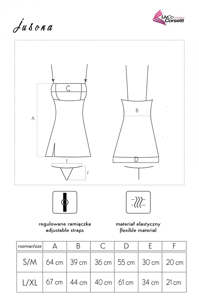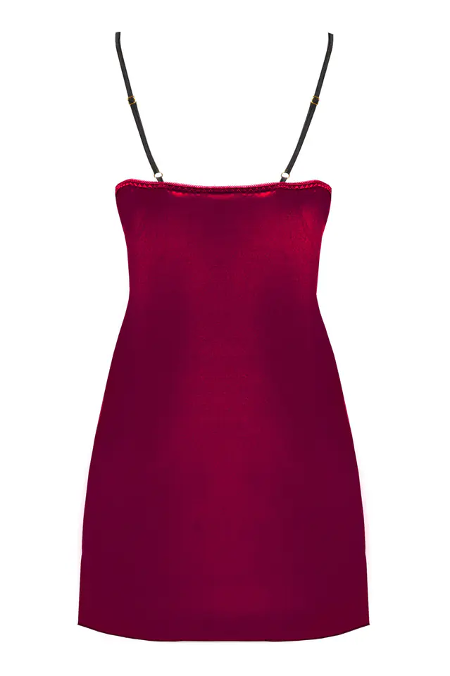 Jusona Cllaret Collection to zestaw złożony z koszulki nocnej i pasujących do kompletu stringów. Model łączy dwa niezwykle kobiece i zmysłowe kolory - lśniące bordo i koronkową czerń. Utrzymana w takich barwach wieczorna stylizacja korzystnie prezentuje się w zestawieniu z każdym odcieniem karnacji skóry. Koszula posiada cienkie ramiączka, odsłaniające linię obojczyków i seksowne rozcięcie na udzie. Jej charakterystycznym elementem są koronkowe aplikacje, zasłaniające biust i dodające uroku. Całość sięga powyżej połowy uda, zakrywając jednak biodra i pośladki.
