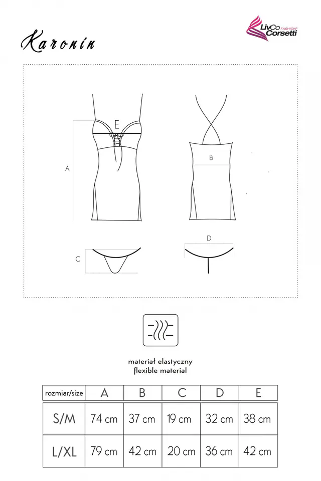 Model Karonin Dubarry Collection zbudowany jest z prostych, klasycznych stringów, prześwitujących spod półtransparentnej koszuli nocnej na ramiączkach. Wierzchni element wykonany został z dwóch rodzajów koronki: jednej gęsto zdobionej przy wykończeniach, a drugiej silniej prześwitującej i odkrywającej ciało. Dodatkowym atutem zestawu, rozpalającym wyobraźnię i zmysły, są dwa długie rozcięcia po bokach koszuli, odsłaniające zmysłową linię bioder.