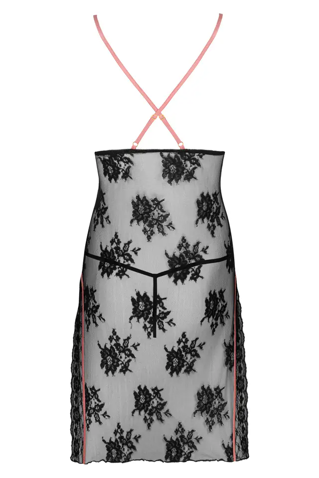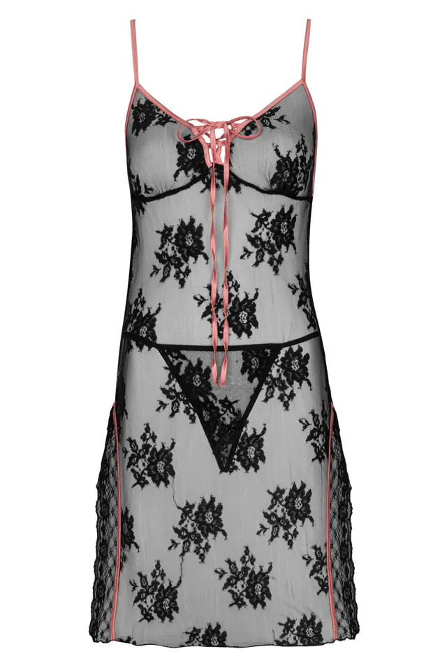 Karonin Dubarry Collection to zestaw złożony ze zmysłowej koszulki nocnej i pasujących stringów w kolorze czarnym. Komplet został wykonany z miękkiej, ażurowej koronki, a dodatkowo udekorowany subtelną pudrowo różową tasiemką, zawiązywaną przy biuście. Tak kontrastujące połączenie słodkiego różu i drapieżnej czerni sprawia, że strój dodaje odwagi i pewności siebie. Z kolei materiał zestawu dba, aby jego użytkowniczka jak najlepiej czuła się we własnym ciele. Koronkę wykonano z przyjemnego w dotyku poliamidu, który nie drapie i dobrze dopasowuje się do kształtów kobiecej sylwetki.