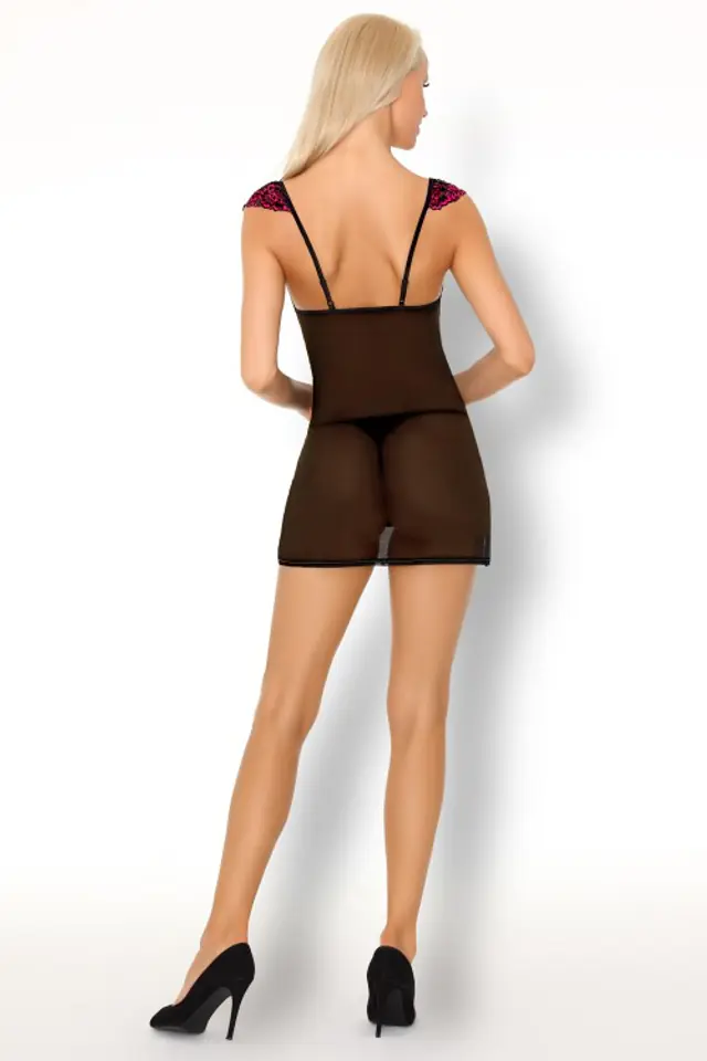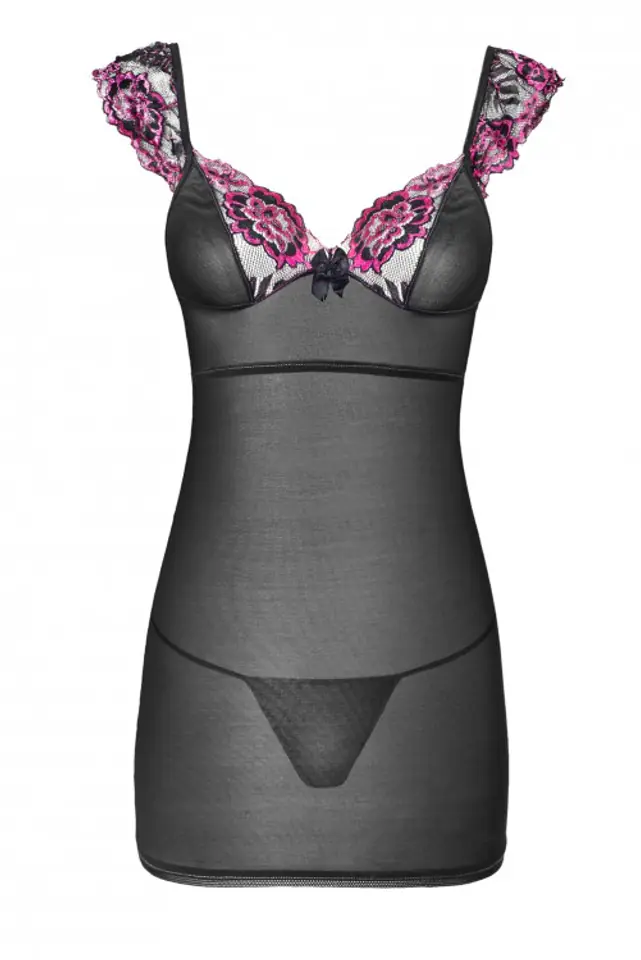 Dopasowana i pięknie okalająca kobiece ciało koszulka o stylowym, klasycznym wykończeniu. Górna część wyróżnia się pięknym ornamentowo-kwiecistym zdobieniem w barwach czerni i różu. Do zestawu dołączone zostały klasyczne stringi, wykonane w takim samym stylu. Kinge - to elegancki podarunek dla każdej z Pań.
