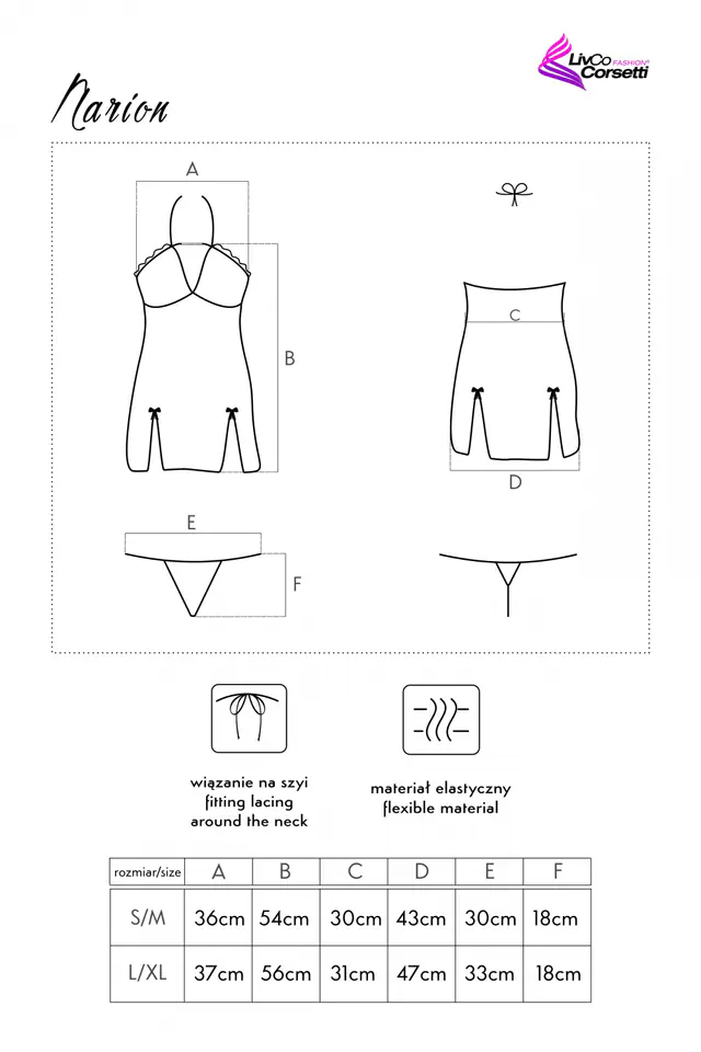 Zmysłowa koszulka nocna i stringi w zestawie. Gorący jak ogień komplet Narion uszyty został z leciutkiego, elastycznego materiału atrakcyjnie układającego się na ciele. Koszulka dwukolorowa, w głębokiej czerwieni biust oraz zdobiące koszulkę małe czerwone wstążeczki (2 z przodu i 2 z tyłu koszulki). Ciekawy dekolt upiększony cyrkoniową ozdobą, z falbankami powyżej piersi. Koszulka półprzezroczysta z paseczkami zakładanymi na szyi, ponętnie odsłania plecy. Krój prosty, lekko taliowany. Z dołu koszulka posiada kuszące rozcięcia fantastycznie odsłaniające pośladki.