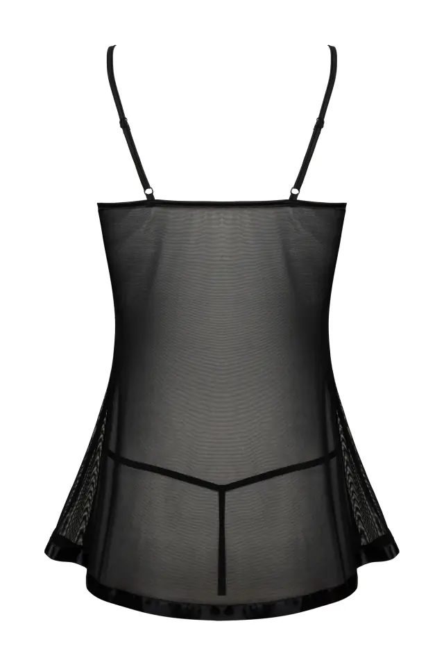 Najwyższej klasy uwodzenie w Twoim zasięgu. Z koszulką Ritea zmiękczysz każde męskie serce. Do kompletu z pasującymi czarnymi majteczkami typu stringi. Koszulka dwukolorowa. Główny kolor, to elegancka, prawie całkowicie nieprzeźroczysta czerń. Kolorowy czerwony akcept zastosowany został w miseczkach koszulki i zdobiących ją dwóch satynowych kokardek. Ciekawym akcentem jest też czarny satynowy pasek wieńczący dół koszulki, która ma luźny fason, lekko rozszerzający się ku dołowi. Koszulka na cienkich ramiączkach, ładnie podkreśla dekolt oraz ramiona. Zdecydowane podkreślenie przypada tu na piersi, które są centralnie odznaczone. Koszulka pięknie prezentuje się na kobietach zarówno bardzo szczupłych, jak i posiadaczek dużych biustów.