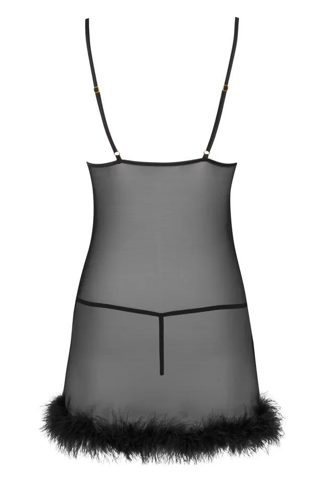 Model Zerunam to komplet złożony ze stringów i koszulki na cienkich ramiączkach, wykonanej z półtransparentnej siateczki. Zestaw jest utrzymany w ponadczasowym i uniwersalnym czarnym kolorze, odpowiednim na każdą okazję. Biustonosz koszuli został stworzony z subtelnej koronki z usztywnieniami, które modelują biust. Charakteru całej stylizacji nadaje jednak fikuśny czarny puszek, który stanowi wykończenie koszulki. Pasujące stringi Zerunam mają klasyczny, prosty fason z koronkowym frontem. Widoczne spod siateczkowej koszulki przyciągają wzrok, ale nie dominują w całościowym zestawieniu.