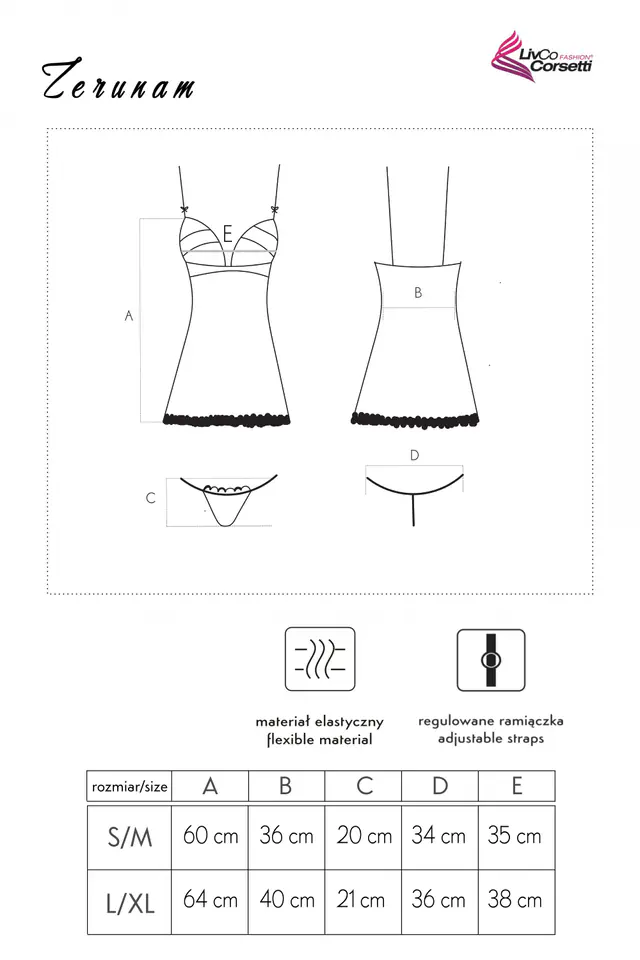 Zerunam to produkt uszyty z mieszanki poliamidu i elastanu - materiału bardzo miękkiego i przyjemnego w dotyku, który dobrze układa się na ciele. Koszulka nie drapie skóry, nie krępuje ruchów i gwarantuje pełen komfort noszenia. Zestaw jest dopasowany do kształtów sylwetki, ale nie opinający. Koszula sięga za linię ud, podkreślając pośladki. Finezyjne wykończenie z czarnego puszku sprawia, że cały komplet prezentuje się wyjątkowo kokieteryjnie.