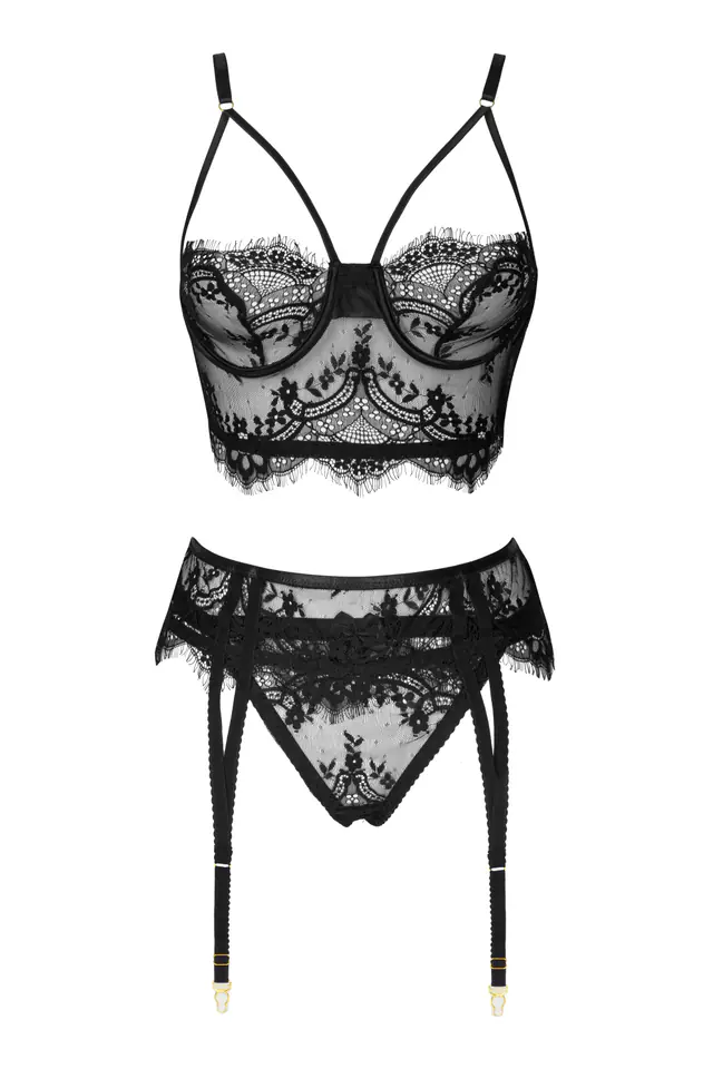 Set Pereas Licorin Collection składa się z biustonosza, majtek i pasa do pończoch, które świetnie zaprezentują się zarówno na szczupłej, jak i na nieco bardziej krągłej sylwetce. Fason kompletu doskonale maskuje bowiem drobne niedoskonałości figury w okolicach bioder czy brzucha. Biustonosz typu bralet zachwyca nietypowymi ramiączkami i zmysłową koronką, a dzięki fiszbinom efektownie unosi biust i pięknie go modeluje. Z kolei majtki z wysokim stanem nadają doskonały kształt kobiecym biodrom i rozpalają zmysły za sprawą subtelnych wycięć.