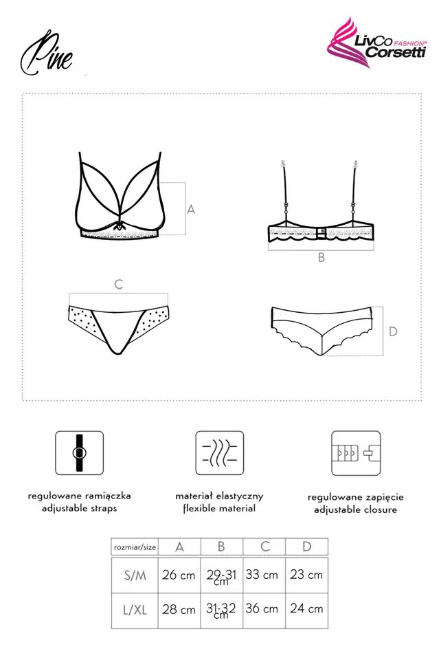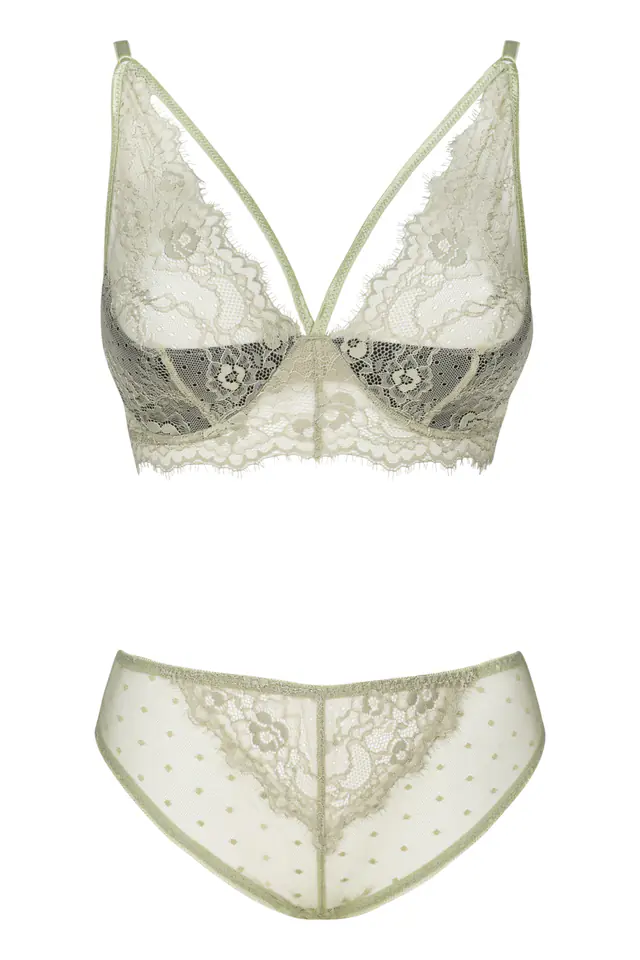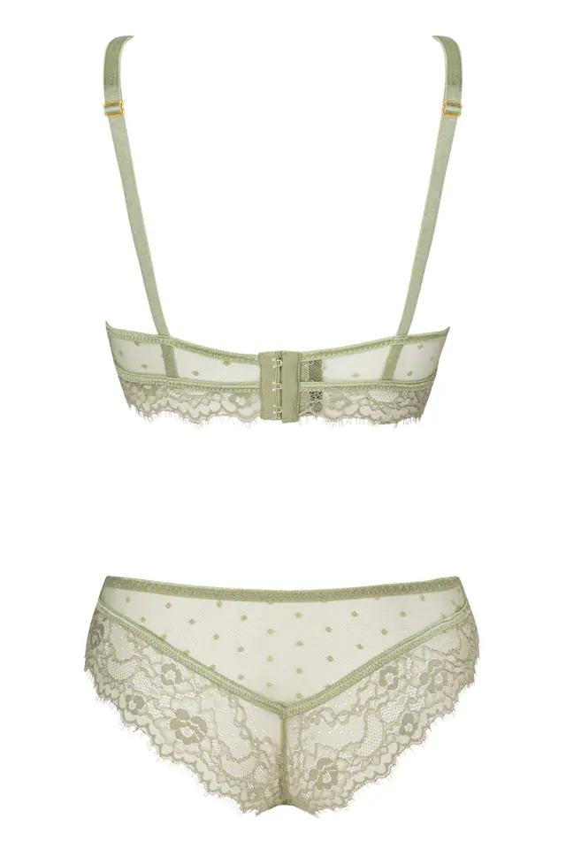 Zestaw bielizny to koronkowe dzieło sztuki. Biustonosz nie jest usztywniany, a dodatkowo został wyposażony w dwa paseczki na dekolcie, dzięki czemu wystając spod koszuli lub bluzki, z pewnością wzbudzą ogromne zainteresowanie. Biustonosz dobrze podtrzymuje biust, co sprawia, że kobiety z większym biustem również będą mogły się na niego skusić. Kusząca bielizna w kolorze przełamanej zieleni to również wygodne i jednocześnie zmysłowe koronkowe majteczki, które mimo, że są nieco bardziej zabudowane, wciąż tworzą seksowny klimat. Konstrukcja majtek doskonale podkreśla kobiece pośladki, dzięki czemu każda kobieta poczuje się wyjątkowo. Zestaw doskonale sprawdzi się do noszenia na co dzień, jak i na nieco bardziej szczególne momenty.