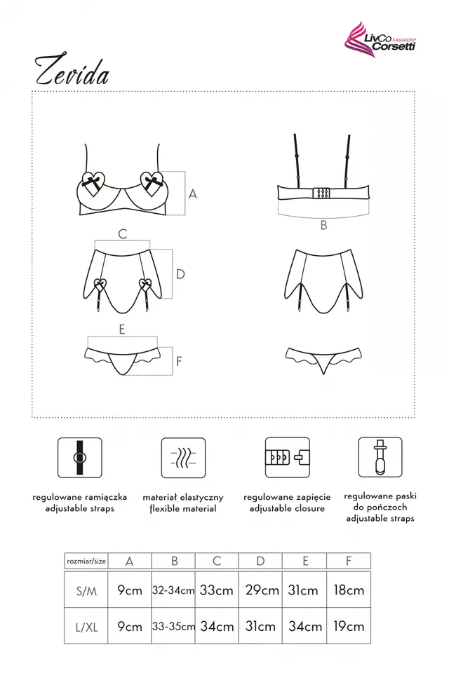 Zniewalający komplet Zevida na wyjątkowe okazje. Lekko perwersyjny z zachowaniem zmysłowej elegancji i wysokiej klasy wykonania. Na zestaw Zevidia składają się urokliwe majteczki z satynowym, wzorzystym przodem i tiulowymi paseczkami po bokach. Oryginalny stanik z wyciętymi miseczkami i paseczkami na piersiach, gdzie umieszczono nakładki na biust w kształcie serduszek z czarnymi kokardkami. Stanik na cienkich ramiączkach, regulowany, zapinany na plecach. W kolorach czerwieni, szyty z błyszczącej satyny. Do kompletu należą wiązania na nadgarstki, imitujące kajdanki. Stworzone z mięciutkiego materiału, wiązane czarnym pasem satyny. Zestaw uzupełnia piękna spódniczka z możliwością łączenia z pończochami.
