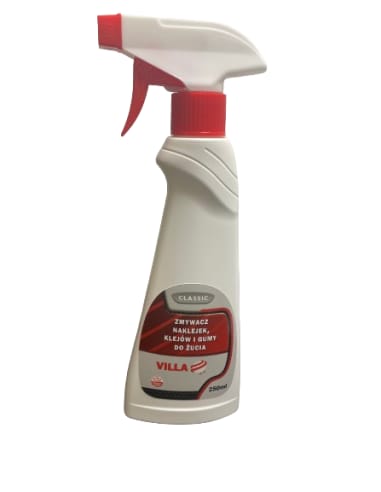 Zmywacz naklejek, klejów i gumy do żucia Classic Villa 250 ml to niezwykle skuteczny preparat na bazie naturalnych składników do usuwania naklejek, etykiet, resztek kleju, gumy do żucia z takich powierzchni jak szyby, okna, drzwi, PCV i tekstylia. Doskonale nadaje się do usuwania plam z atramentu, tuszu, szminki, sadzy itp.