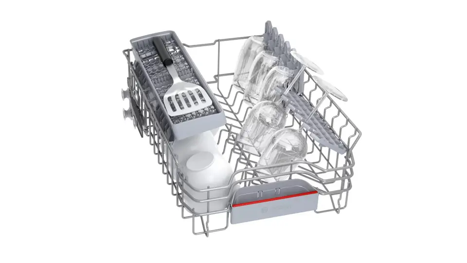 System regulacji położenia górnego kosza Rackmatic, służy dopasowaniu wnętrza do aktualnych potrzeb. System pozwala zmienić ustawienie kosza na różnych wysokościach, a wybraną pozycję można łatwo zmienić, nawet gdy kosz jest pełen. Dzięki temu możesz dostosować wnętrze do swoich potrzeb nawet dla bardzo wysokich talerzy w dolnym koszu, czy wysokich kieliszków czy kufli w górnym koszu.