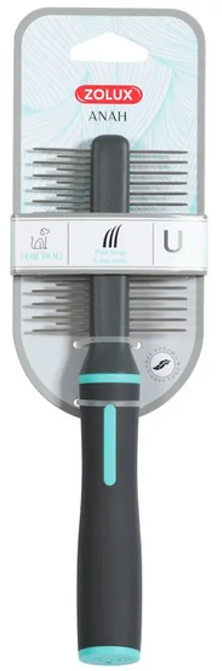 ZOLUX ANAHPrezentujemy nową, kompletną gamę produktów do pielęgnacji ANAH, stworzoną w odpowiedzi na wszystkie potrzeby psów i kotów.Zaprojektowaliśmy nowy uchwyt, który zapewnia większą wygodę użytkowania i idealnie leży w dłoni, dzięki ergonomicznemu kształtowi, miękkiemu i przyjemnemu w dotyku wykończeniu SOFT TOUCH oraz powłoce z gumy termoplastycznej i miękkim wypustkom. Dodatkowo, niezależnie od rozmiaru produktu, uchwyt ma jeden rozmiar, który idealnie leży w dłoni.Produkty zaprojektowano w nowoczesnym stylu, w modnych, stonowanych kolorach: dla psów w kolorach turkusu i antracytu, dla szczeniąt w kolorach turkusu i bieli, a dla kotów - w kolorach pudrowego różu i bieli. Harmonijne i dynamiczne kształty produktów z pewnością przypadną do gustu użytkownikom.Jakość jest głównym atutem nowej kolekcji produktów do pielęgnacji ANAH. Produkty wykonane są z tworzywa ABS, które jest szczególnie odporne na upływ czasu. Umieszczony pomiędzy rękojeścią a główką szczotki pierścień z gumy termoplastycznej sprawia, że produkt stabilnie leży w dłoni. Wszystkie metalowe elementy, tj. ostrza, zęby i wypustki, wykonano ze stali nierdzewnej.GRZEBIEŃ DWUSTRONNYGrzebień dwustronny delikatnie rozczesuje, usuwa martwy podszerstek i wygładza sierść. Strona z szeroko rozstawionymi zębami rozczesuje i wygładza sierść, zapobiegając powstawaniu kołtunów. Zaokrąglone na końcach zęby chronią skórę zwierzęcia przed podrażnieniem.Grzebień jest odpowiedni do sierści długiej.Wymiary produktu: 65 x 25 x 216 mm